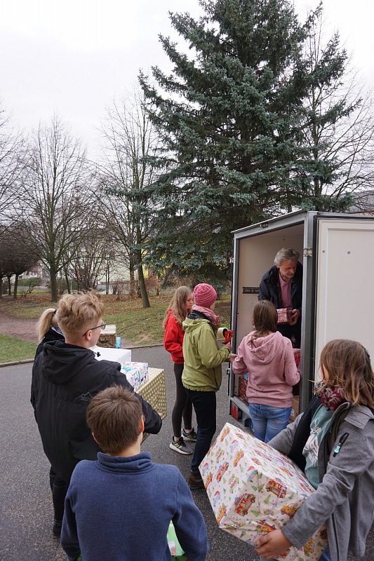 Stellvertretend für die Schülerschaft überreichte der Schülerrat Herrn Oertel 45 Weihnachtspäckchen und half dabei, sie ihm in den Anhänger zu laden, der die Pakete nach Rumänien bringt.