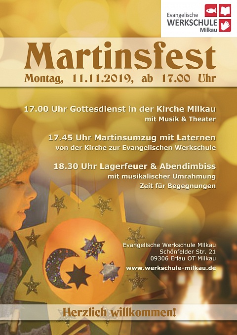 17 Uhr begann der Gottesdienst in der gut besuchten Milkauer Kirche. Zwei Schüler der Werkschule erzählten die Geschichte des Sankt Martin aus Sicht des Bettlers und die Kinder aus dem Kinderland erfreuten alle mit einem schönen Lied. Im Anschluss zogen wir mit unseren Laternen in Richtung der Werkschule, wo wir den Abend am Feuer und mit Liedern des Posaunenchors ausklingen ließen.