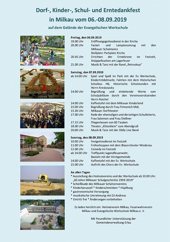 Ab 14:00 Uhr findet im Rahmes des Dorf-, Kinder-, Schul- und Erntedankfestes dann unser Schuljubiläum statt, zu welchem Sie natürlich auch herzlich eingeladen sind.