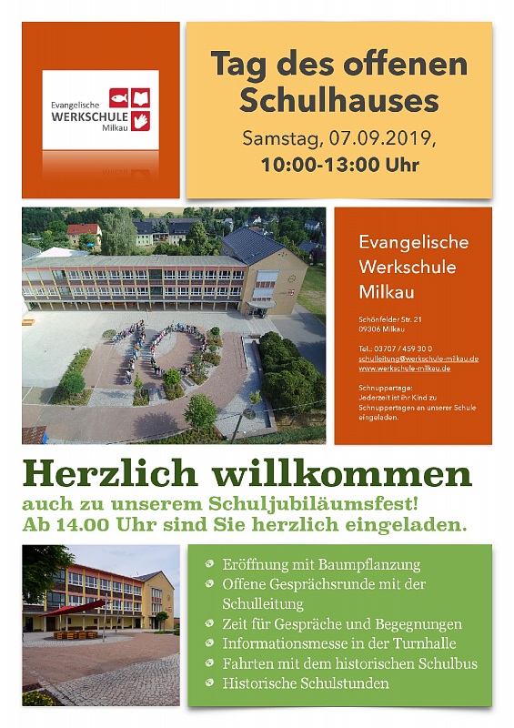 Hiermit möchten wir Sie rechtherzlich zu unserem Tag des offenen Schulhauses am 07.09.2019 von 10:00-13:00 an der Evangelischen Werkschule Milkau einladen.